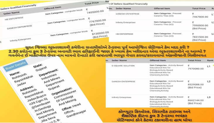 ખાણખનીજ હેઠળ જિલ્લા મિનરલ ફંડ એવી એક રાષ્ટ્રીય યોજના હેઠળ સુરત જિલ્લા ભૂસ્તરશાસ્ત્રી કચેરીને કોમ્પ્યુટર કિઓસ્ક, સિરામીક ટાઇલ્સ અને શૈક્ષણિક કીટ સહિતની વસ્તુઓ ખરીદવા વહીવટી મંજૂરીઓ આવી હતી. નાણાંકીય વર્ષ 2025-26 દરમ્યાન સુરત જિલ્લા ભૂસ્તરશાસ્ત્રી કચેરીના સત્તાધીશોએ 75 લાખના ખર્ચ હેઠળ કોમ્પ્યુટર કિઓસ્ક અને બીજા 75 લાખના ખર્ચ હેઠળ સિરામીક ટાઇલ્સ ખરીદવા ઓનલાઇન ગવર્નમેન્ટ ઈ માર્કેટપ્લેસ ઉપર ટેન્ડર કર્યું હતુ. બરોબર આ દરમ્યાન એક્ટિવીટી બેઈઝ એજ્યુકેશન કીટનું 80 લાખનું પણ એક ટેન્ડર કર્યું હતુ. આ ત્રણેય બીડમાં કૌભાંડી ટોળકીએ અથવા કૌભાંડી વેપારી એજન્ટોએ ટેન્ડર અપલોડ થતાં પહેલાં મોટું સેટિંગ્સ પાડી વેપાર કબ્જે કરવા ગોઠવણ કરી હતી. જેના ભાગરૂપે ટેકનિકલ ચકાસણીને અંતે રિવર્સ ઓક્શનમાં તદ્દન બનાવટી ભાવ હરિફાઈ/ભાવ ઓફર કરી, દેખાડા પૂરતું કરી ત્રણેય ટેન્ડર આપ્યા/લીધા હતા. વાંચો નીચેના ફકરામાં.