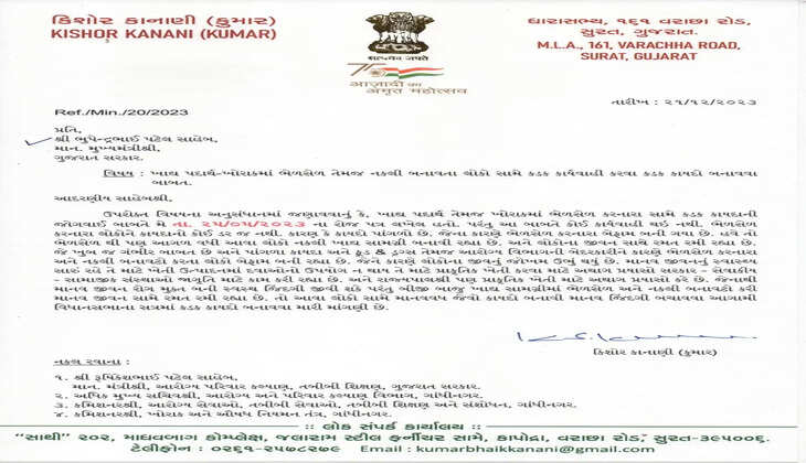 રજૂઆત@સુરત: પૂર્વ આરોગ્ય મંત્રી કુમાર કાનાણીની ખાદ્ય પદાર્થમાં થતી ભેળસેળ મામલે કાયદો બનાવવા માંગ