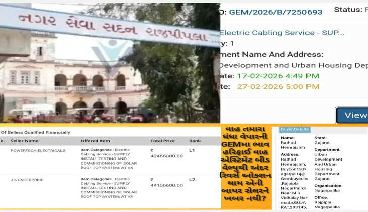 નર્મદા જિલ્લાના મુખ્ય મથક એવા રાજપીપળા નગરપાલિકાના ચીફ ઓફિસરને ગવર્નમેન્ટ ઈ માર્કેટપ્લેસ ઉપર એજન્સીઓની રિંગ દેખાતી નથી. આ અધિકારીના કહેવા મુજબ અમે બધું બરાબર કર્યું અને ગવર્નમેન્ટ ઈ માર્કેટપ્લેસ ઉપર કર્યું છે એટલે બરાબર છે. હવે અહિં જ સૌથી મોટો ખુલાસો થાય તેમ છે. રાજપીપળા નગરપાલિકાએ ફેબ્રુઆરી 2026 દરમ્યાન ઈલેક્ટ્રિક કેબલિંગ સર્વિસ કેટેગરીમાં સોલાર લાઇટનુ ટેન્ડર કર્યું હતુ. GEM/2026/B/7250693 નંબરના આ બીડની એસ્ટિમેટ બીડ વેલ્યુ 4કરોડ 25 લાખ હતી ત્યારે ટેકનિકલ ચકાસણી બાદ માત્ર 2 એજન્સી વચ્ચે ભાવ ઓફરની સ્પર્ધા થઈ હતી. સંપૂર્ણ બનાવટી, દેખાડો કરવા પૂરતી, પૂર્વ આયોજિત સેટિંગ્સના દુર્ગંધથી ભરપૂર એવી આ સ્પર્ધામાં એલ2 એજન્સીએ ઈરાદાપૂર્વક આર.એ દરમ્યાન ભાગ લીધો નહિ. કેમ કે, આ એલ2 એજન્સીએ એસ્ટિમેટ બીડ વેલ્યુથી વધારે ભાવ ઓફર કર્યા ત્યારે પોતાની મળતિયા એલ1 એજન્સીને વગર સ્પર્ધાએ બીડ લેવાનો માર્ગ મોકળો થઈ ગયો હતો. વાંચો નીચેના ફકરામાં.
