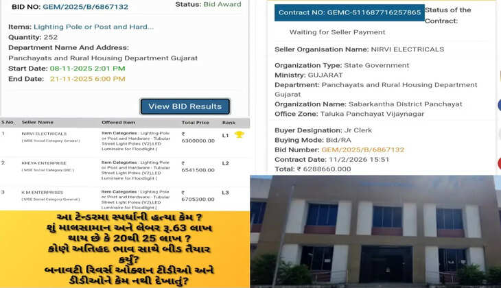 વિજયનગર તાલુકા પંચાયતે લાઈટિંગ પોલ માટે રૂ. 63 લાખની ગ્રાન્ટ હેઠળ ઓનલાઇન ગવર્નમેન્ટ ઈ માર્કેટપ્લેસ ઉપર ટેન્ડર કર્યું હતુ. ઓક્ટોબર નવેમ્બર 2025 દરમ્યાન થયેલા આ ટેન્ડરનો માલસામાન, મજૂરી અને ઈન્સ્ટોલેશન સહિતનો ખર્ચ સરેરાશ રૂ. 20થી25 લાખ થાય તેમ છતાં રૂ.63 લાખનું ટેન્ડર તૈયાર કરી પૂર્વ આયોજિત સેટિંગ્સના ભાગરૂપે મનસ્વી ખરીદ વેચાણના વેપારને અંજાભ આપ્યો છે. મસમોટો ખર્ચ તો ખરો જ સાથે સાથે ટેન્ડર પ્રક્રિયામાં પણ મિલીભગત થતાં ઈરાદાપૂર્વક સ્પર્ધા નહિ કરી કે નહિ કરાવી પારદર્શક સ્પર્ધા વગર જ રિવર્સ ઓક્શન પૂર્ણ થયું હતું. રૂ.63 લાખનું ટેન્ડર છે તેની એજન્સીઓને જાણકારી હોવા છતાં અને રિવર્સ ઓક્શન બીડ વેલ્યુની અંદર થાય તેની જાણકારી છતાં એલ3 એજન્સીએ રૂ.6705300 નો ભાવ ઓફર કર્યો જ્યારે એલ2 એજન્સીએ રૂ. 6541500 નો ભાવ ઓફર કરી એલ1 એજન્સીને કોઈ સ્પર્ધા આપી નહિ. આથી એલ1 એજન્સીએ રૂ.63 લાખનો ભાવ ઓફર આપ્યો ત્યારે બાયર એવી વિજયનગર તાલુકા પંચાયતે રૂ.63 લાખથી માત્ર રૂ.11,340 ઓછાં કરાવી તાત્કાલિક વર્ક ઓર્ડર આપ્યો છે. આ સમગ્ર ટેન્ડરમા ઈરાદાપૂર્વક અને પૂર્વ આયોજિત સેટિંગ્સ હોવા છતાં ટીડીઓથી માંડી ડીડીઓ સહિતના કેવીરીતે આંખ આડા કાન કરી રહ્યા તે પણ સમજવા જેવું છે. વાંચો નીચેના ફકરામાં.