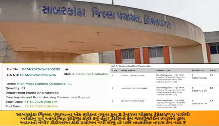 સાબરકાંઠા જિલ્લા પંચાયતની વિકાસ શાખાને છેલ્લા કેટલાક મહિનાઓથી ભરપૂર વહીવટી મંજૂરીઓ માલસામાનની ખરીદી માટે આવી રહી છે. તત્કાલીન મહિલા ડેપ્યુટી ડીડીઓ કાપડીયાબેને એલઈડી લાઈટિંગનુ 57 લાખનું ટેન્ડર કર્યું તેમાં સંપૂર્ણ બનાવટી અને નાટ્યાત્મક ભાવ ઓફર/ ભાવ ઘટાડાની પ્રક્રિયા થઈ હતી. 57 લાખનુ ટેન્ડર કોઈપણ ફરિફાઇ વગર એલ1 લાવવામાં આવેલ પૂર્વ આયોજિત સેટિંગ્સવાળી એજન્સીને ફાળે ગયું હતુ. 57 લાખ બીડ વેલ્યુની જાણ હોવા છતાં એલ2 અને એલ3 એજન્સીએ ઈરાદાપૂર્વક વધારે ભાવ ઓફર કર્યા હતા. હવે હાલના ડેપ્યુટી ડીડીઓ ગીતાબેન ઠાકોરે કુલ 51 હાઇમાસ્ટ લાઈટિંગનુ ટેન્ડર કર્યું તેમાં પણ બનાવટી અને દેખાડો કરવા પૂરતી પૂર્વ આયોજિત સેટિંગ્સવાળી આર.એ પ્રક્રિયા થઈ છે. 51 લાખ બીડ વેલ્યુની જાણકારી હોવા છતાં બાયર અને સેલરે ઈરાદાપૂર્વક એલ1 એજન્સીને કોઈપણ સ્પર્ધા કરાવ્યા વિના રૂપિયા 50,50,782 થી વર્ક ઓર્ડર કરાવી દીધો છે.